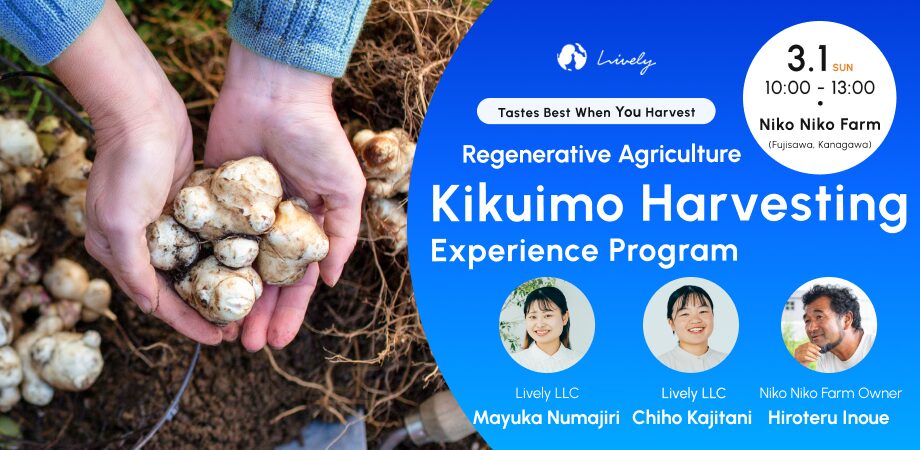 Lively will co-host the “Regenerative Agriculture: Kikuimo Harvesting Experience Program” with Niko Niko Farm on Sunday, March 1, 2026. The event will be held at the Niko Niko Farm, operated by the NPO ma,icca!! in Fujisawa City, Kanagawa Prefecture, which practices regenerative agriculture. Participants will engage in Kikuimo harvesting in the fields and vegetable tasting using farm-harvested produce. Through these activities, they will explore food practices that connect to the next generation and learn about sustainable forms of agriculture.