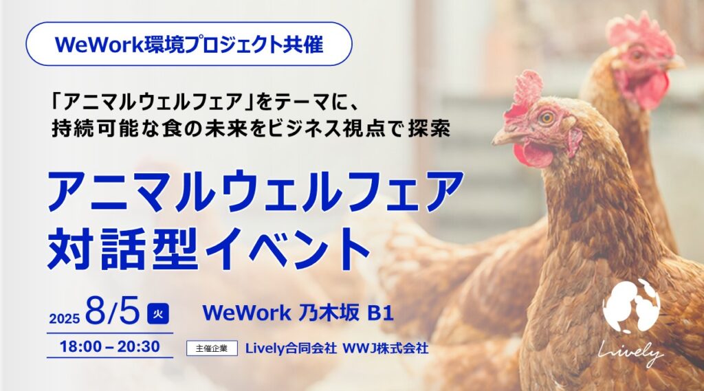 この度、2025年8月5日(火)にLively合同会社は、WeWork Japanと共同で「アニマルウェルフェア対話型イベント アニマルウェルフェアをテーマに、持続可能な食の未来をビジネス視点で探索」を開催いたします。
