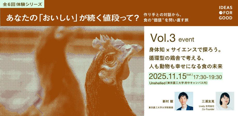 この度、2025年11月15日(土)にLively合同会社は、社会をもっとよくする世界のアイデアマガジン「IDEAS FOR GOOD」(運営:ハーチ株式会社)と共同で「身体知×サイエンスで探ろう。循環型の鶏舎で考える、人も動物も幸せになる食の未来」を開催します。