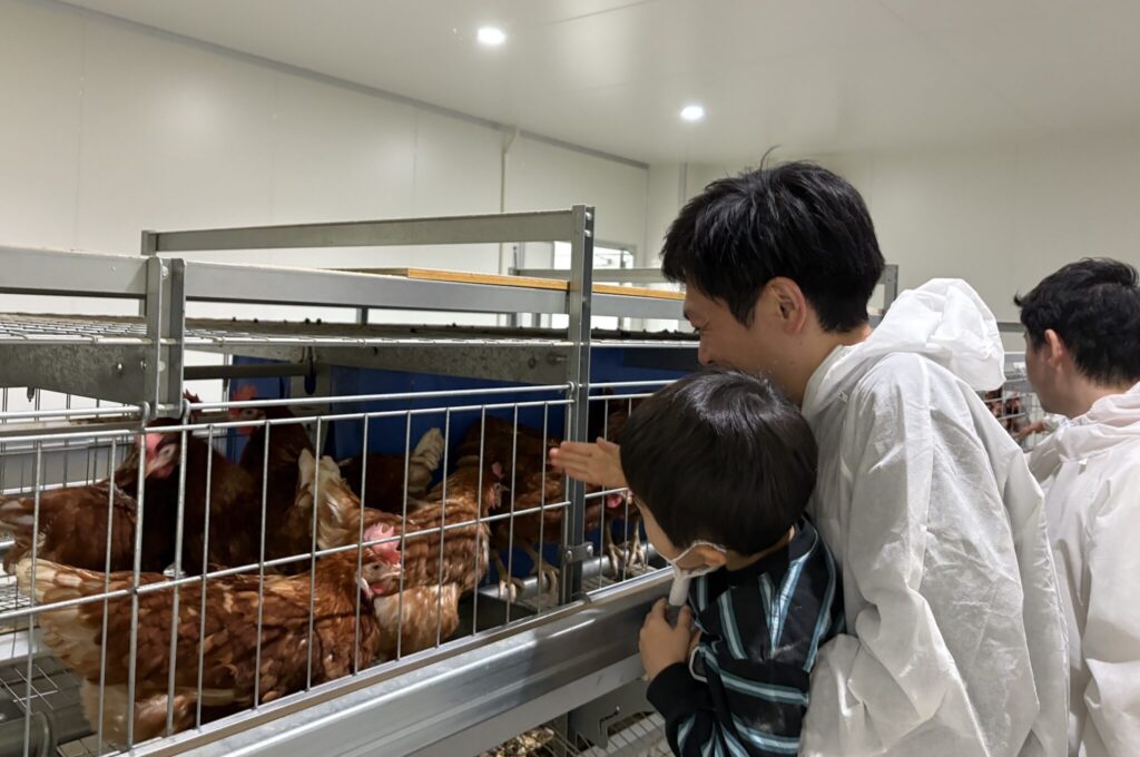 イベント会場となった「Unshelled(アンシェルド)」は、採卵鶏の4種類の飼育システム(ケージ、エンリッチドケージ、多段式エイビアリー、放牧場)を直接見学でき、見学室から開放的な空間で飼育される採卵鶏を観察できる先進的な施設です。本イベントでは、実際に鶏舎内に入り、鶏を間近で観察しながら情動に触れる貴重な体験を提供しました。